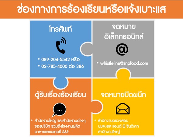 บริษัทฯ ให้ความสำคัญและคุณค่ากับผู้มีส่วนได้เสียทุกกลุ่มของบริษัท จึงจัดทำแพลตฟอร์มเพื่อเป็นการสนับสนุนการรับข้อร้องเรียนหรือการแจ้งเบาะแสที่เกี่ยวข้องกับการทุจริตหรือพฤติกรรมที่ผิดจริยธรรมภายในองค์กร ซึ่งสามารถแจ้งเรื่องร้องเรียนได้ตลอดผ่านช่องทางต่อไปนี้