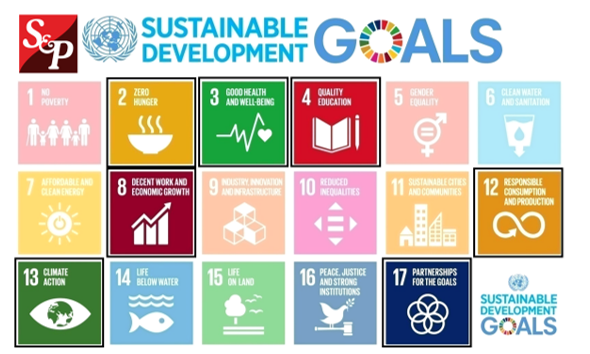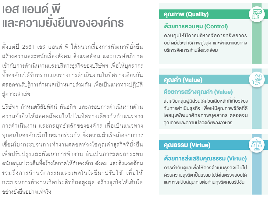 เอส แอนด์ พี จัดตั้งสำนักพัฒนาความยั่งยืนและสื่อสารองค์กรขึ้นเป็นครั้งแรกในปี 2561 เพื่อติดตามและรับผิดชอบงานด้านบรรษัทภิบาล ความรับผิดชอบต่อสังคม และความยั่งยืน ให้ตอบสนองต่อประเด็นสำคัญของบริษัท โดยกำหนดแนวทางการดำเนินธุรกิจที่สอดคล้องกับเป้าหมายการพัฒนาอย่างยั่งยืนของสหประชาชาติ และทิศทางการพัฒนาความยั่งยืนของโลก ได้แก่ Sustainable Development Goals (SDGs) ใน 7 ข้อ ได้แก่