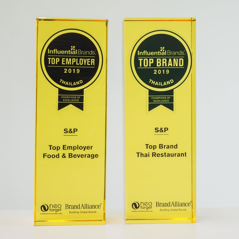 บริษัท เอส แอนด์ พี ซินดิเคท จำกัด (มหาชน) รับมอบ2 รางวัลแห่งปี "Top Brand Thai Restaurant และ Top Employer (Food & Beverage) 2019" ภายในงาน “2019 Asia CEO Summit & Award Ceremony” จัดโดย อินฟลูเอ็นเชี่ยลแบรนด์ (ประเทศสิงคโปร์) ซึ่งเป็นรางวัลสุดยอดแบรนด์แห่งเอเชียประเภทต่าง ๆ เพื่อสร้างชื่อเสียงให้แบรนด์เป็นที่รู้จักและได้รับความเชื่อถือยิ่งขึ้นในภูมิภาคเอเชีย ณ ห้อง Chatrium Ballroom โรงแรมChatrium Hotel Riverside Bangkok ถนนเจริญกรุง