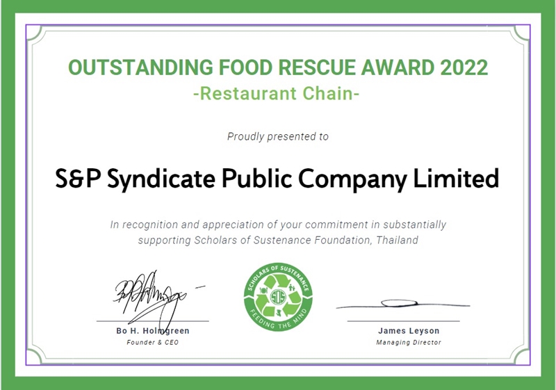 S&P รับรางวัล SOS Awards 2022 ด้าน OUTSTANDING FOOD RESCUE AWARD - RESTAURANT CHAIN