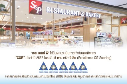 ‘เอส แอนด์ พี’ ได้รับผลประเมินการกำกับดูแลกิจการ บริษัทจดทะเบียนไทย ประจำปี 2567 (CGR) ในระดับ 5 ดาว อย่างต่อเนื่อง